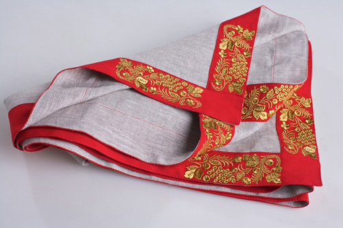 декорирована красной тесьмой по периметру, на углах вышивка в стиле хохломы.